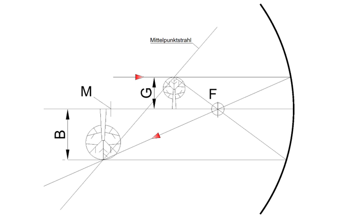 - Bildgröße (B) = Gegenstand (G), G steht auf dem Krümmungsmittelpunkt (M)