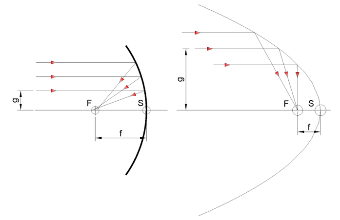 - der horizontaler Abstand () zwischen dem Schnittpunkt des reflektierten Strahls durch die optische Achse () und dem optischen Mittelpunkt ()